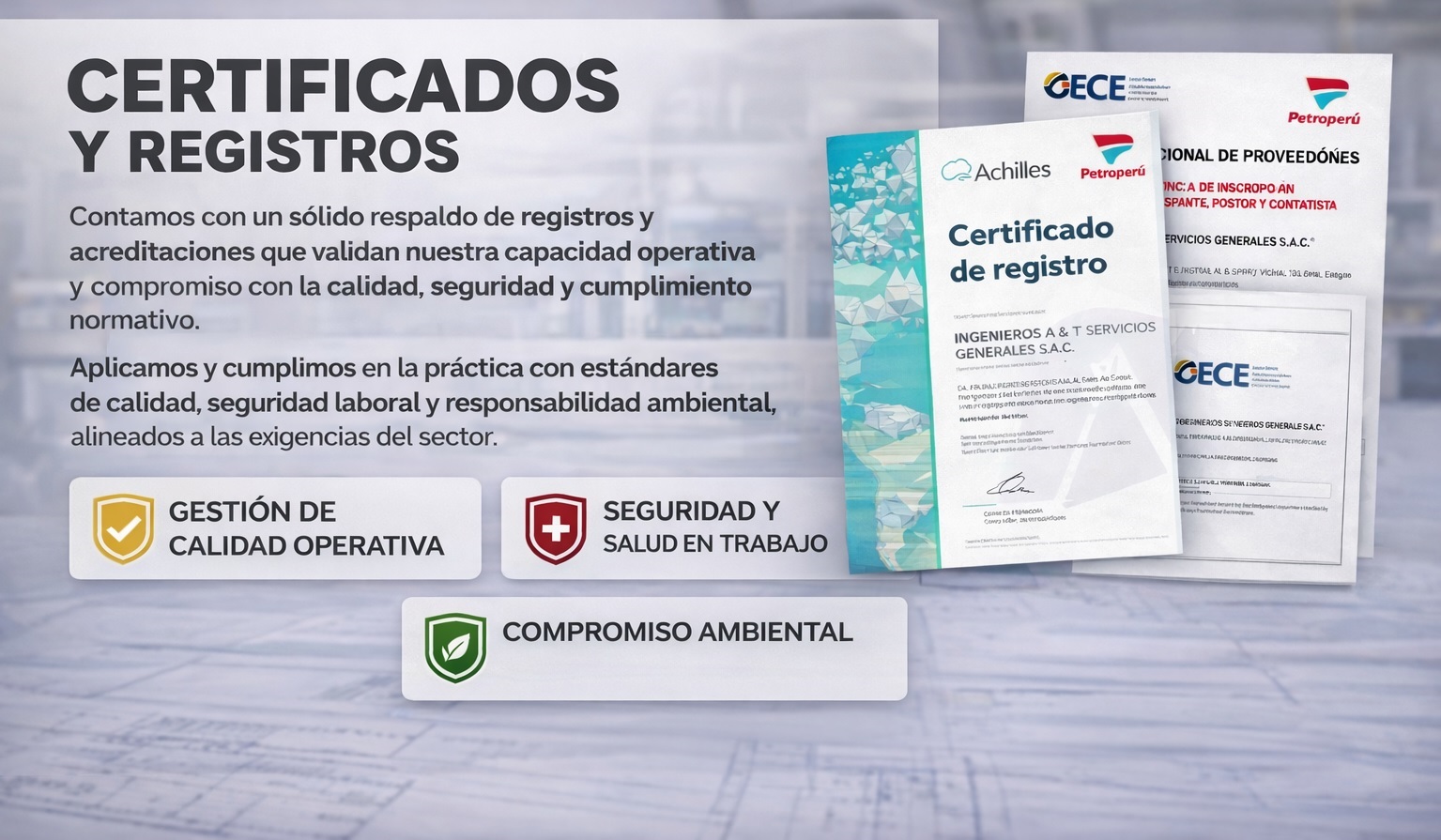 El certificado de registro de achilles acredita que la empresa Ingenieros A & T Servicios Generales s.A.C. Se encuentra inscrita en la base de datos de proveedores calificados utilizada por Petroperú, lo que valida su capacidad para participar en procesos de contratación de bienes y servicios. Este registro demuestra que la empresa cumple con los requisitos administrativos, técnicos y de evaluación establecidos por la plataforma, fortaleciendo su confiabilidad y presencia en el sector.